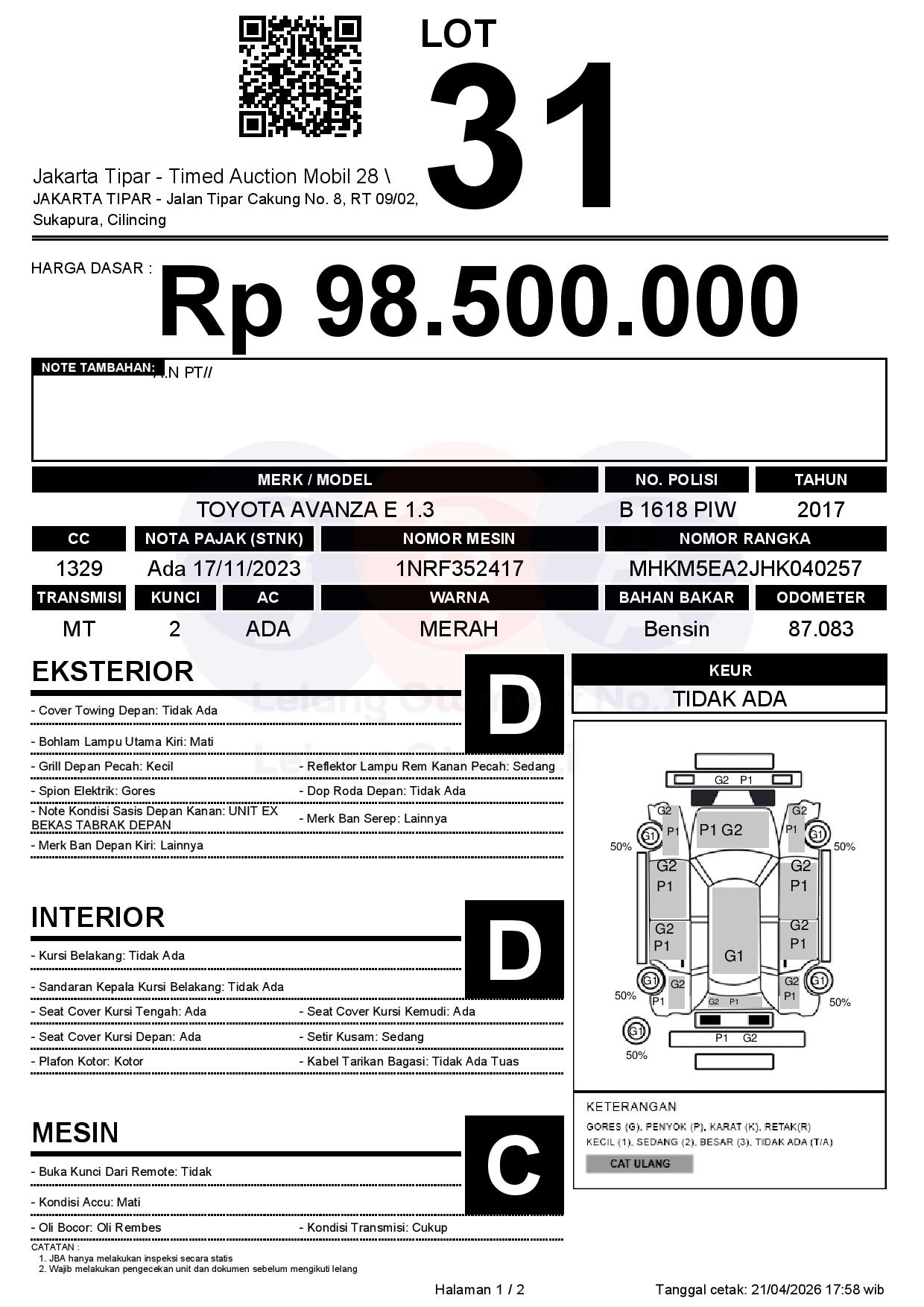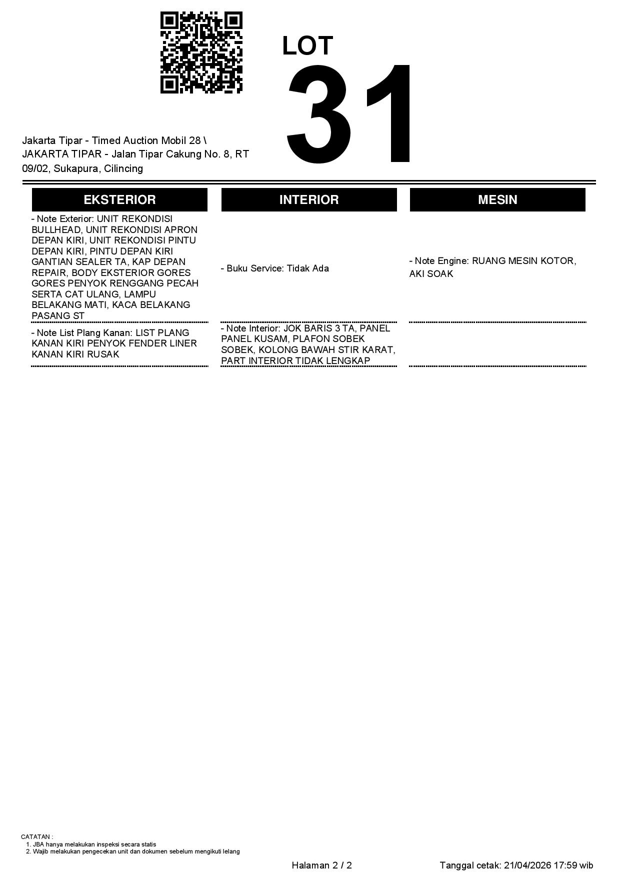 - Kondisi objek lelang dilelang apa adanya, baik kondisi fisik, mesin maupun legalitas kendaraan. Jika terdapat kekurangan/cacat baik yang terlihat maupun yang tidak terlihat, maka semua akan menjadi tanggung jawab/risiko Pemenang Lelang. Oleh karena itu, Pemenang Lelang melepaskan segala hak untuk menuntut dan/atau meminta ganti rugi atas hal tersebut kepada JBA.