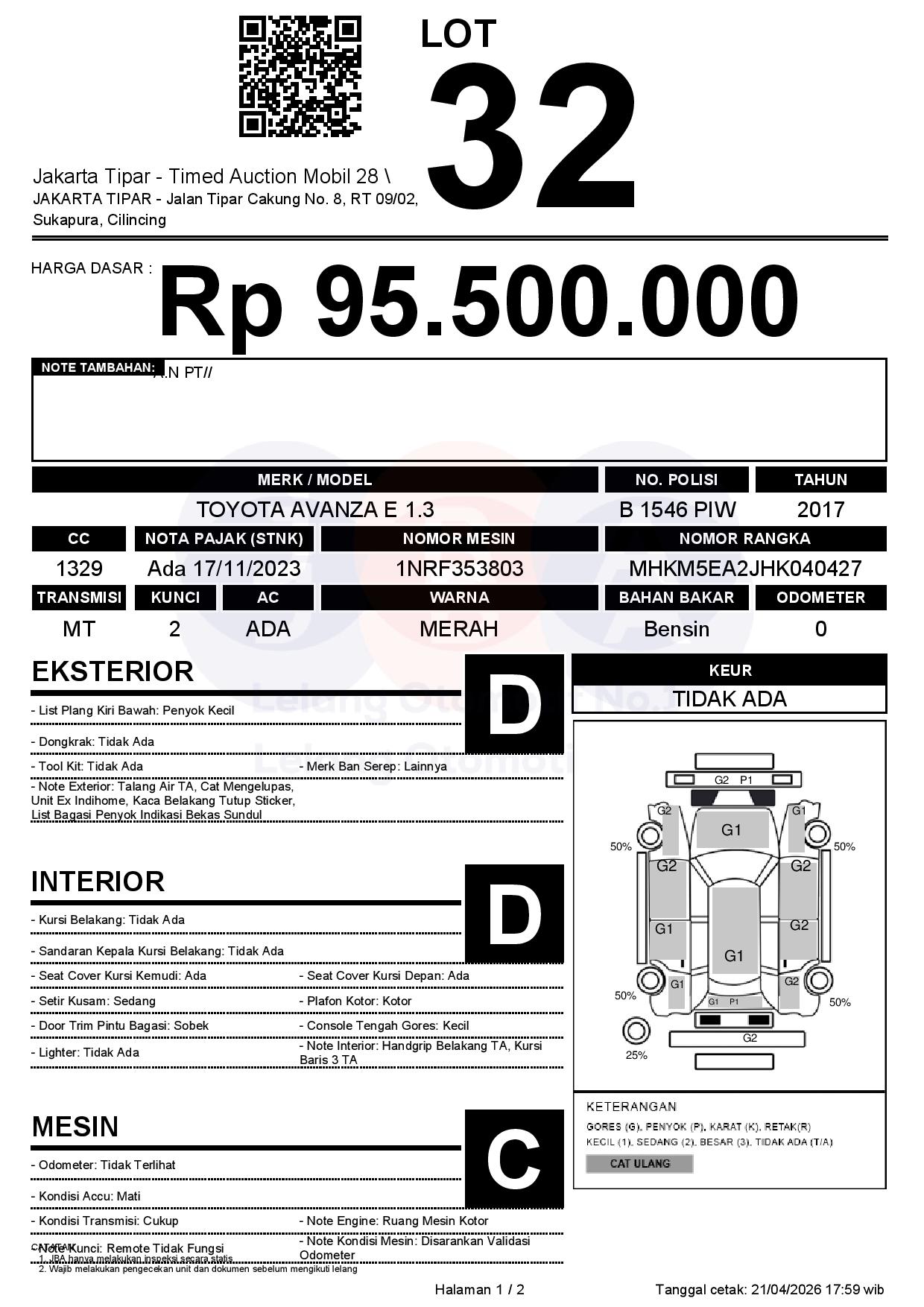 - Kondisi objek lelang dilelang apa adanya, baik kondisi fisik, mesin maupun legalitas kendaraan. Jika terdapat kekurangan/cacat baik yang terlihat maupun yang tidak terlihat, maka semua akan menjadi tanggung jawab/risiko Pemenang Lelang. Oleh karena itu, Pemenang Lelang melepaskan segala hak untuk menuntut dan/atau meminta ganti rugi atas hal tersebut kepada JBA.