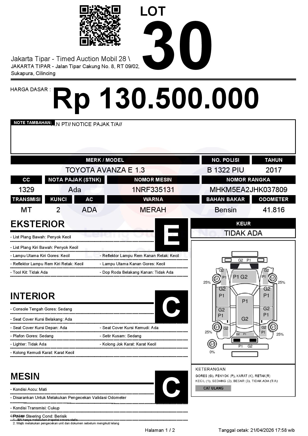 - Kondisi objek lelang dilelang apa adanya, baik kondisi fisik, mesin maupun legalitas kendaraan. Jika terdapat kekurangan/cacat baik yang terlihat maupun yang tidak terlihat, maka semua akan menjadi tanggung jawab/risiko Pemenang Lelang. Oleh karena itu, Pemenang Lelang melepaskan segala hak untuk menuntut dan/atau meminta ganti rugi atas hal tersebut kepada JBA.