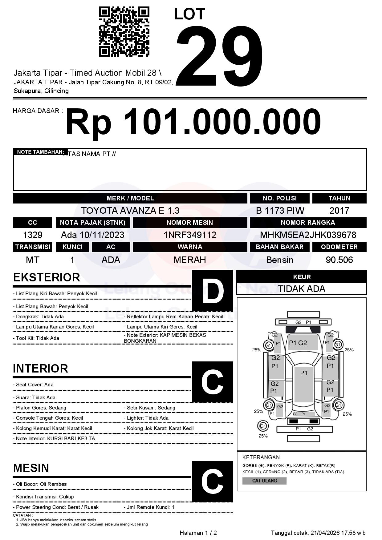 - Kondisi objek lelang dilelang apa adanya, baik kondisi fisik, mesin maupun legalitas kendaraan. Jika terdapat kekurangan/cacat baik yang terlihat maupun yang tidak terlihat, maka semua akan menjadi tanggung jawab/risiko Pemenang Lelang. Oleh karena itu, Pemenang Lelang melepaskan segala hak untuk menuntut dan/atau meminta ganti rugi atas hal tersebut kepada JBA.
