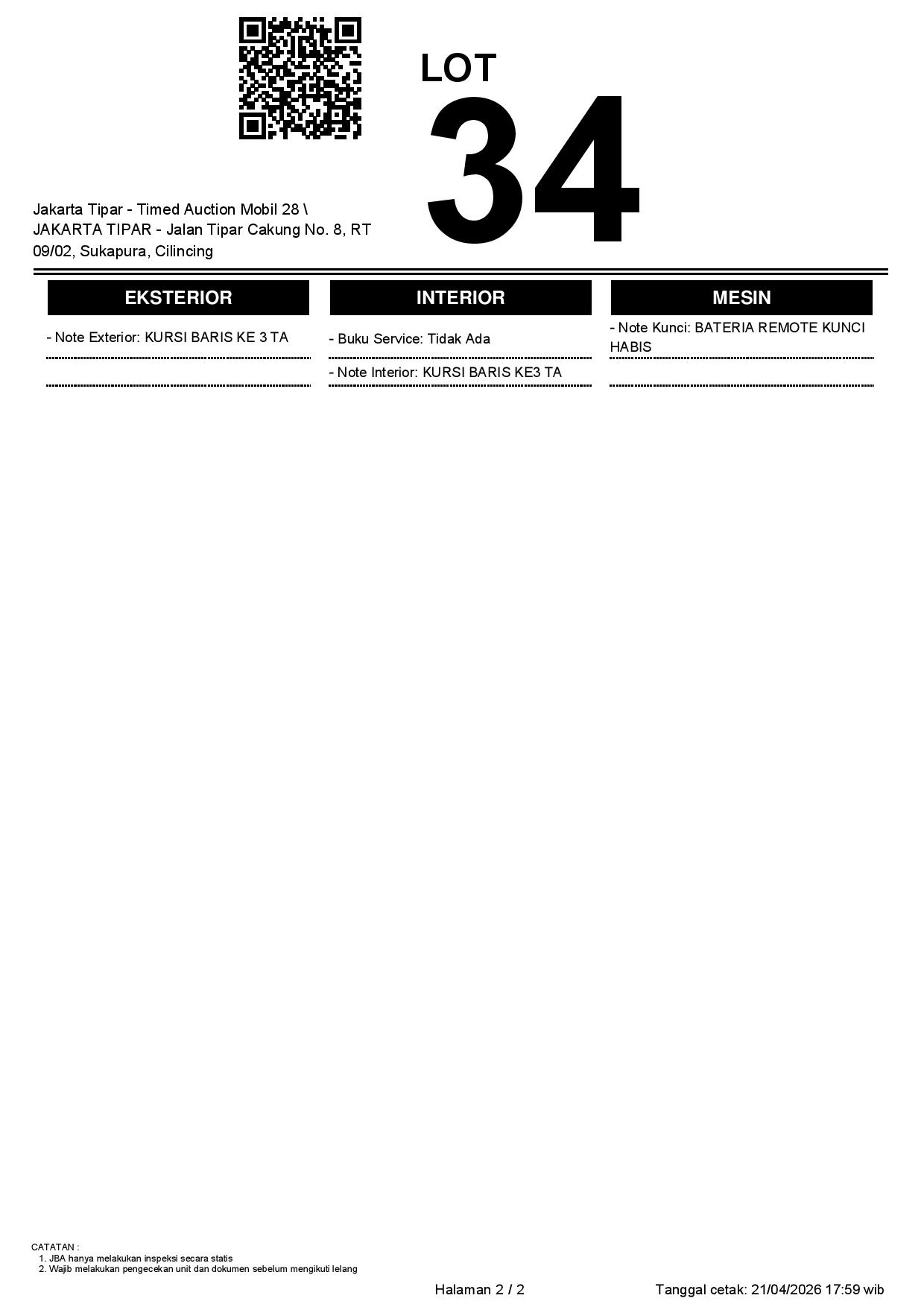 - Kondisi objek lelang dilelang apa adanya, baik kondisi fisik, mesin maupun legalitas kendaraan. Jika terdapat kekurangan/cacat baik yang terlihat maupun yang tidak terlihat, maka semua akan menjadi tanggung jawab/risiko Pemenang Lelang. Oleh karena itu, Pemenang Lelang melepaskan segala hak untuk menuntut dan/atau meminta ganti rugi atas hal tersebut kepada JBA.