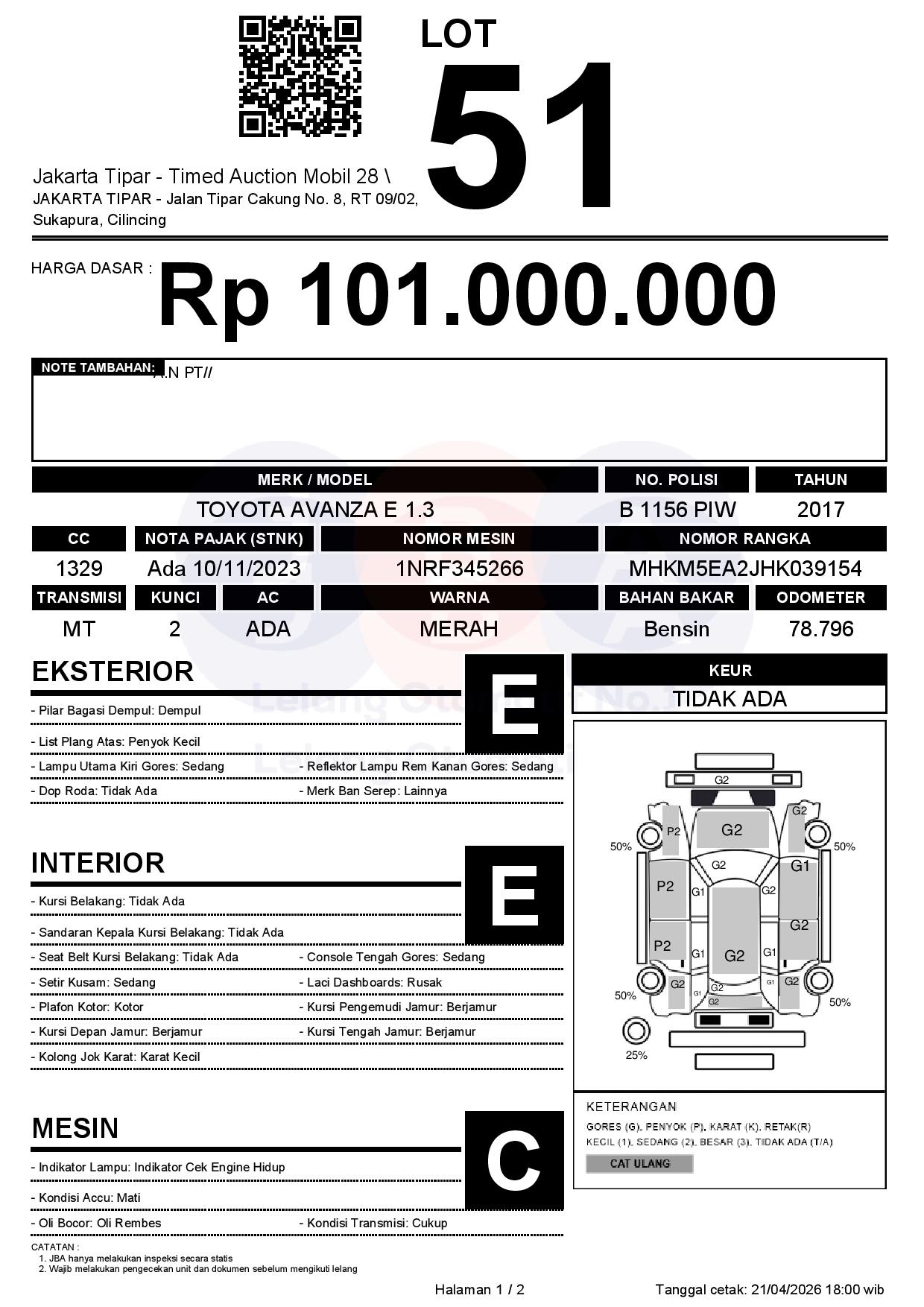 - Kondisi objek lelang dilelang apa adanya, baik kondisi fisik, mesin maupun legalitas kendaraan. Jika terdapat kekurangan/cacat baik yang terlihat maupun yang tidak terlihat, maka semua akan menjadi tanggung jawab/risiko Pemenang Lelang. Oleh karena itu, Pemenang Lelang melepaskan segala hak untuk menuntut dan/atau meminta ganti rugi atas hal tersebut kepada JBA.