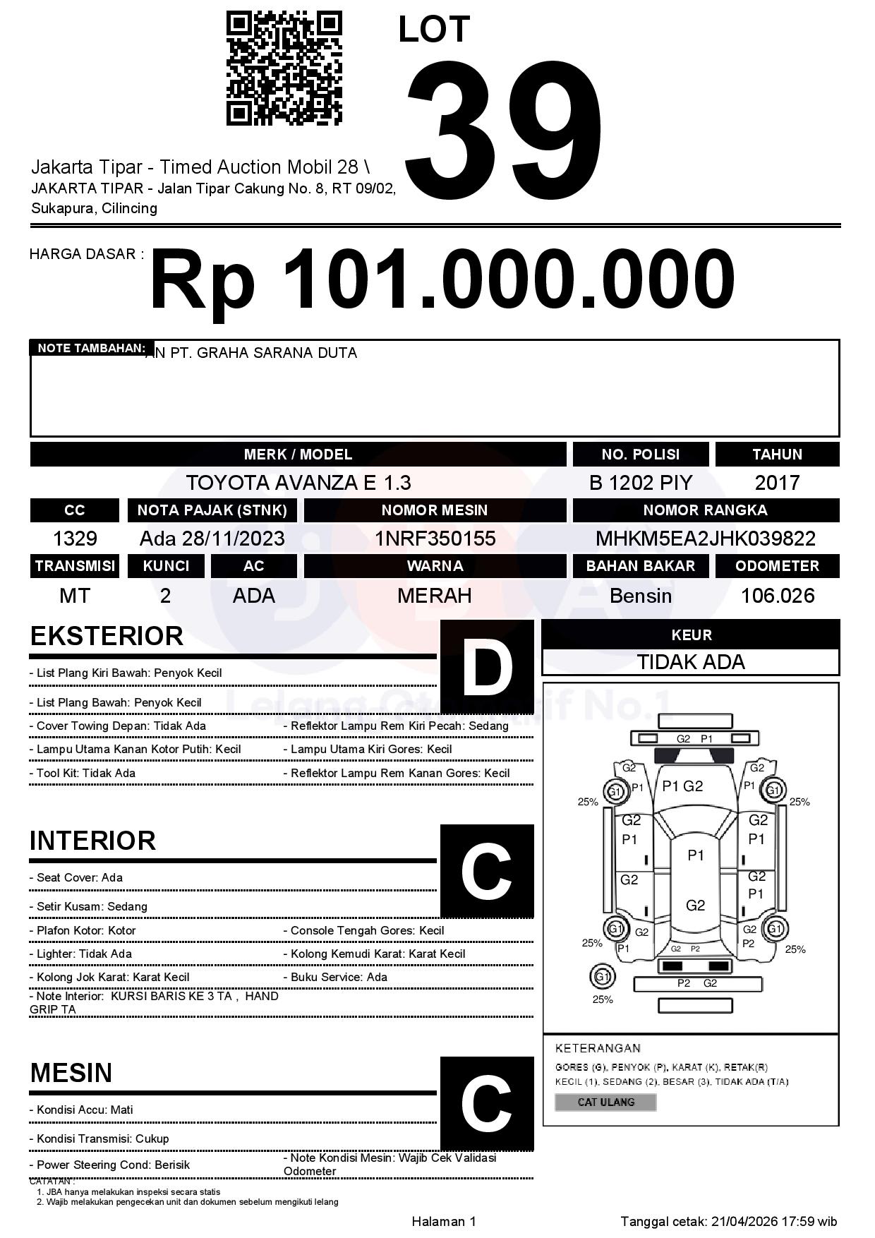 - Kondisi objek lelang dilelang apa adanya, baik kondisi fisik, mesin maupun legalitas kendaraan. Jika terdapat kekurangan/cacat baik yang terlihat maupun yang tidak terlihat, maka semua akan menjadi tanggung jawab/risiko Pemenang Lelang. Oleh karena itu, Pemenang Lelang melepaskan segala hak untuk menuntut dan/atau meminta ganti rugi atas hal tersebut kepada JBA.