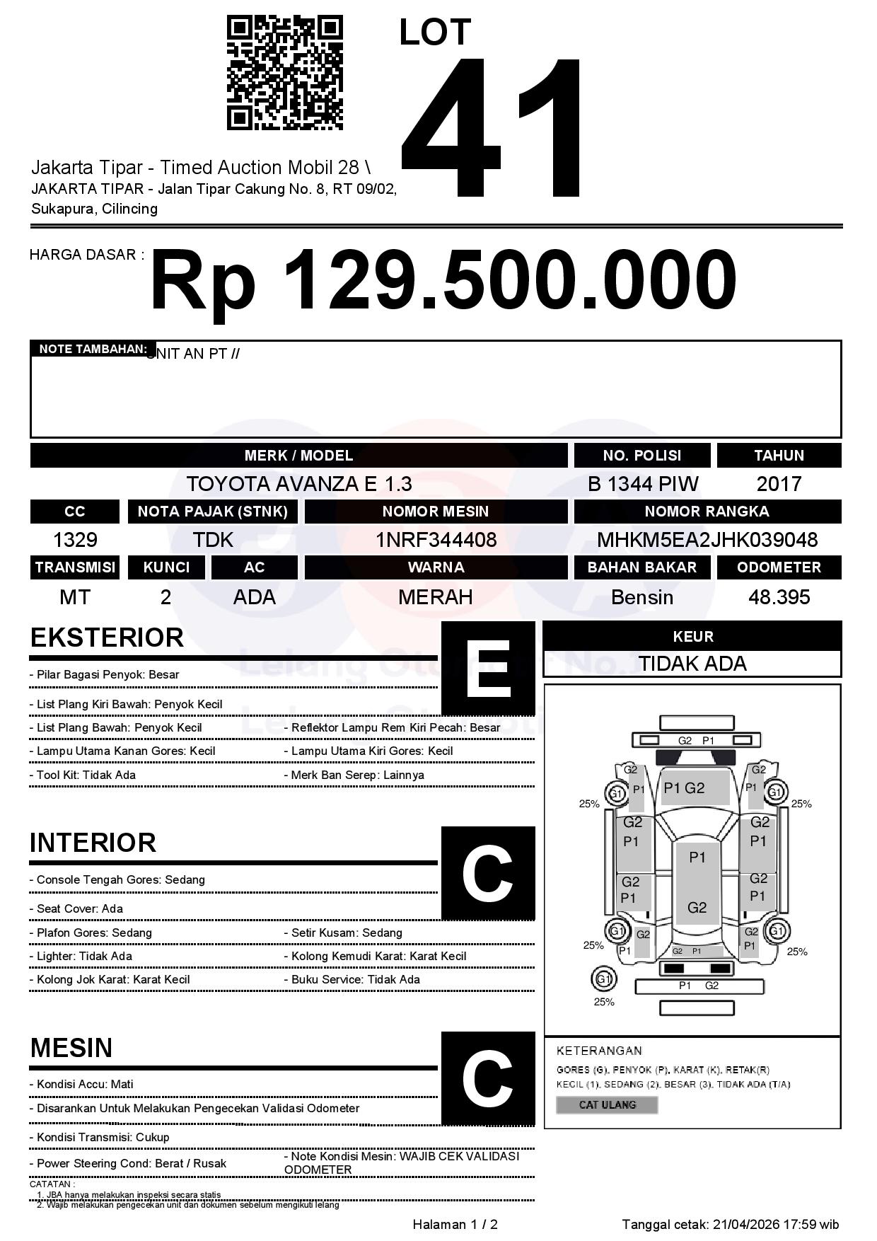 - Kondisi objek lelang dilelang apa adanya, baik kondisi fisik, mesin maupun legalitas kendaraan. Jika terdapat kekurangan/cacat baik yang terlihat maupun yang tidak terlihat, maka semua akan menjadi tanggung jawab/risiko Pemenang Lelang. Oleh karena itu, Pemenang Lelang melepaskan segala hak untuk menuntut dan/atau meminta ganti rugi atas hal tersebut kepada JBA.
