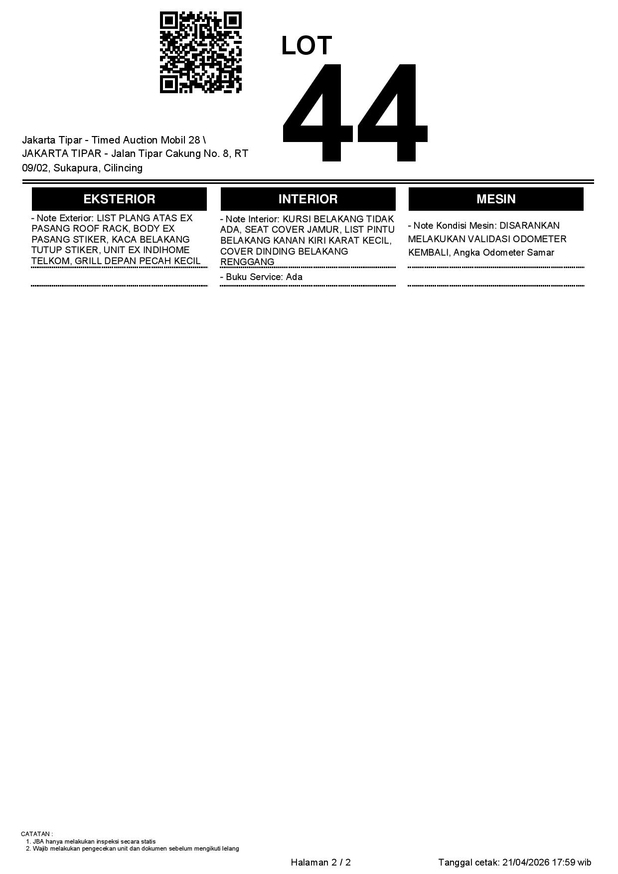 - Kondisi objek lelang dilelang apa adanya, baik kondisi fisik, mesin maupun legalitas kendaraan. Jika terdapat kekurangan/cacat baik yang terlihat maupun yang tidak terlihat, maka semua akan menjadi tanggung jawab/risiko Pemenang Lelang. Oleh karena itu, Pemenang Lelang melepaskan segala hak untuk menuntut dan/atau meminta ganti rugi atas hal tersebut kepada JBA.