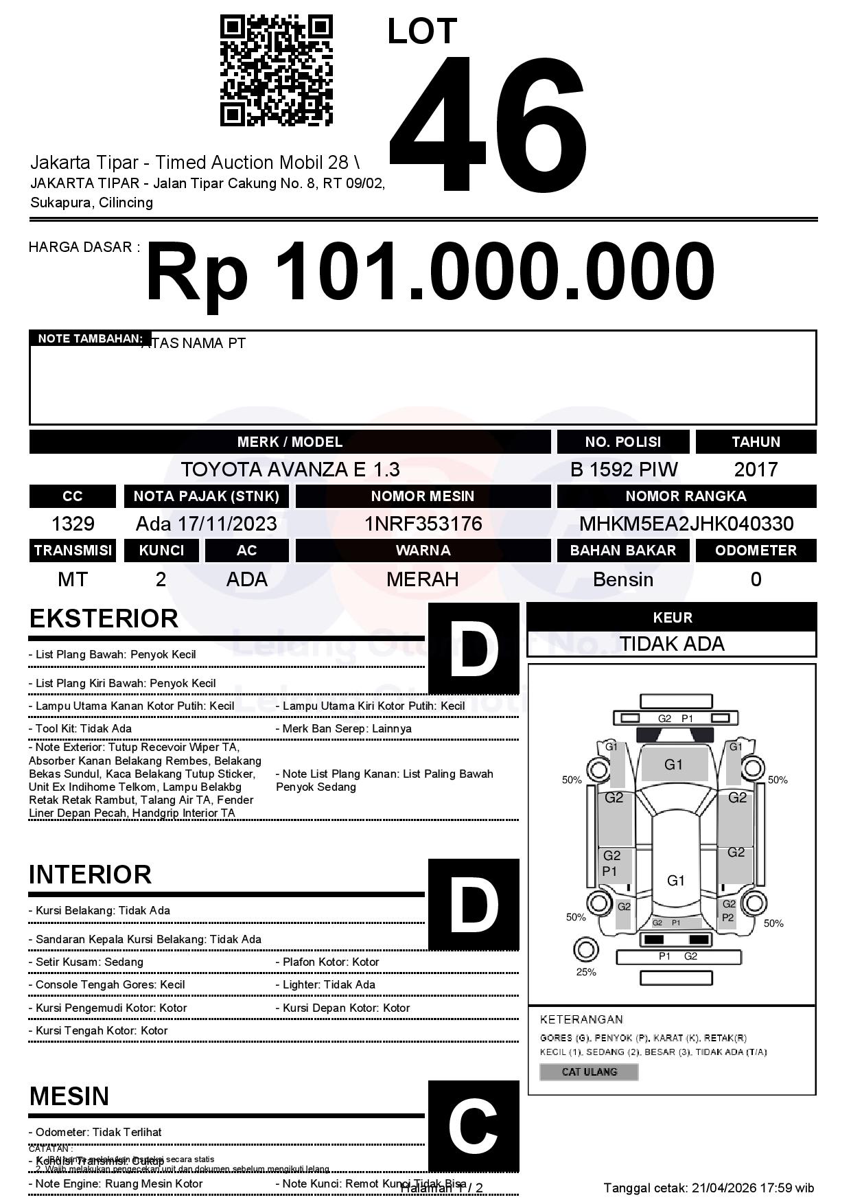 - Kondisi objek lelang dilelang apa adanya, baik kondisi fisik, mesin maupun legalitas kendaraan. Jika terdapat kekurangan/cacat baik yang terlihat maupun yang tidak terlihat, maka semua akan menjadi tanggung jawab/risiko Pemenang Lelang. Oleh karena itu, Pemenang Lelang melepaskan segala hak untuk menuntut dan/atau meminta ganti rugi atas hal tersebut kepada JBA.