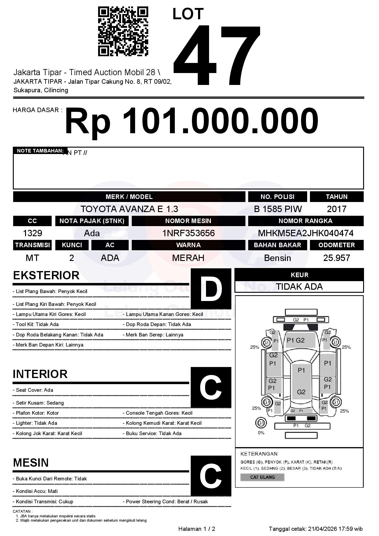 - Kondisi objek lelang dilelang apa adanya, baik kondisi fisik, mesin maupun legalitas kendaraan. Jika terdapat kekurangan/cacat baik yang terlihat maupun yang tidak terlihat, maka semua akan menjadi tanggung jawab/risiko Pemenang Lelang. Oleh karena itu, Pemenang Lelang melepaskan segala hak untuk menuntut dan/atau meminta ganti rugi atas hal tersebut kepada JBA.