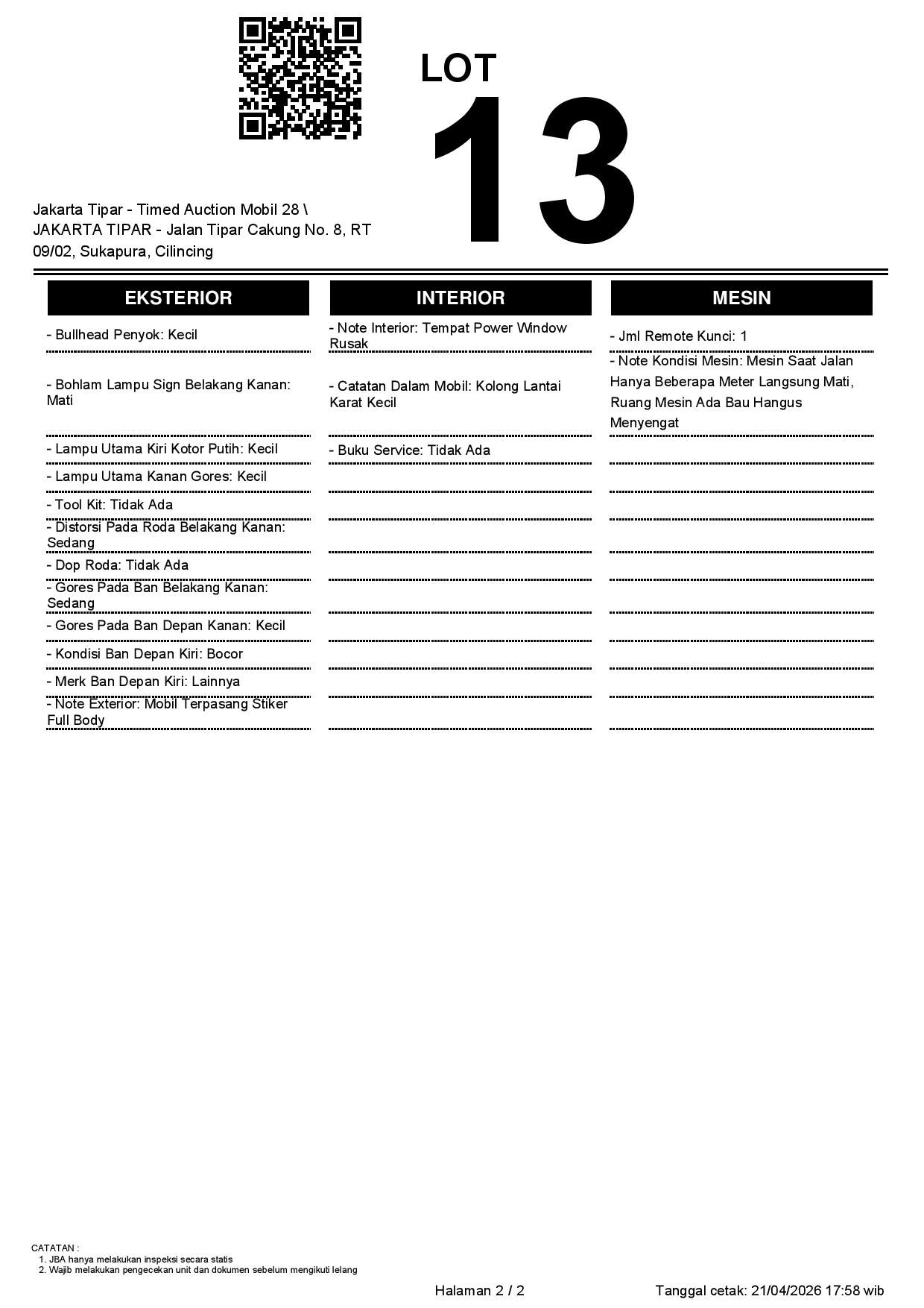 - Kondisi objek lelang dilelang apa adanya, baik kondisi fisik, mesin maupun legalitas kendaraan. Jika terdapat kekurangan/cacat baik yang terlihat maupun yang tidak terlihat, maka semua akan menjadi tanggung jawab/risiko Pemenang Lelang. Oleh karena itu, Pemenang Lelang melepaskan segala hak untuk menuntut dan/atau meminta ganti rugi atas hal tersebut kepada JBA.