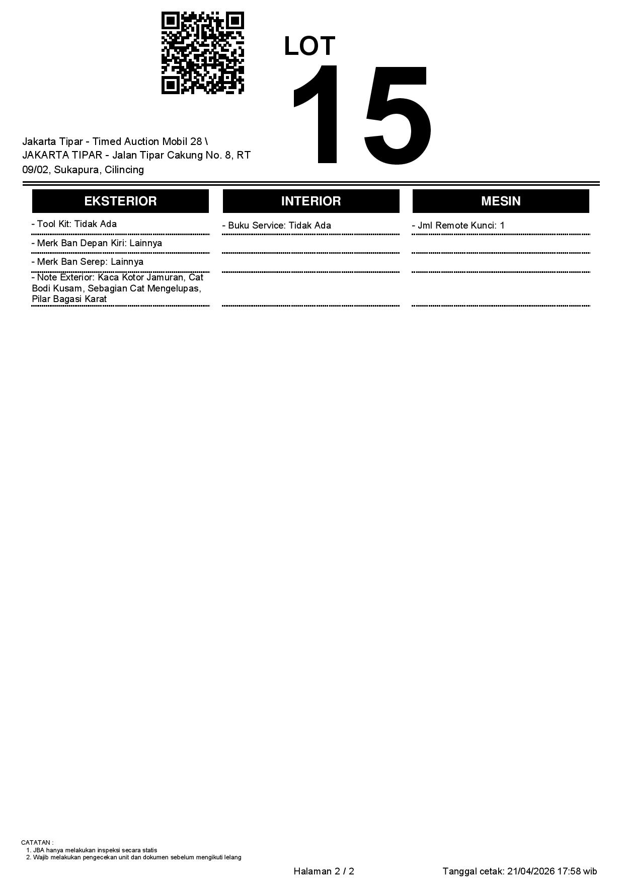 - Kondisi objek lelang dilelang apa adanya, baik kondisi fisik, mesin maupun legalitas kendaraan. Jika terdapat kekurangan/cacat baik yang terlihat maupun yang tidak terlihat, maka semua akan menjadi tanggung jawab/risiko Pemenang Lelang. Oleh karena itu, Pemenang Lelang melepaskan segala hak untuk menuntut dan/atau meminta ganti rugi atas hal tersebut kepada JBA.