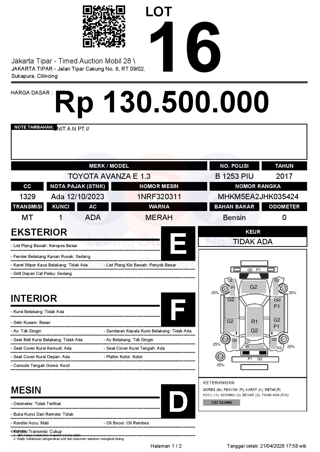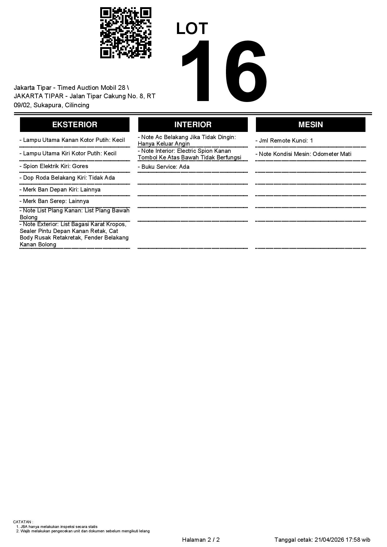 - Kondisi objek lelang dilelang apa adanya, baik kondisi fisik, mesin maupun legalitas kendaraan. Jika terdapat kekurangan/cacat baik yang terlihat maupun yang tidak terlihat, maka semua akan menjadi tanggung jawab/risiko Pemenang Lelang. Oleh karena itu, Pemenang Lelang melepaskan segala hak untuk menuntut dan/atau meminta ganti rugi atas hal tersebut kepada JBA.