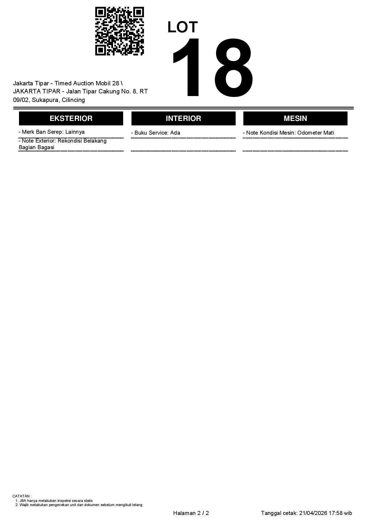 - Kondisi objek lelang dilelang apa adanya, baik kondisi fisik, mesin maupun legalitas kendaraan. Jika terdapat kekurangan/cacat baik yang terlihat maupun yang tidak terlihat, maka semua akan menjadi tanggung jawab/risiko Pemenang Lelang. Oleh karena itu, Pemenang Lelang melepaskan segala hak untuk menuntut dan/atau meminta ganti rugi atas hal tersebut kepada JBA.