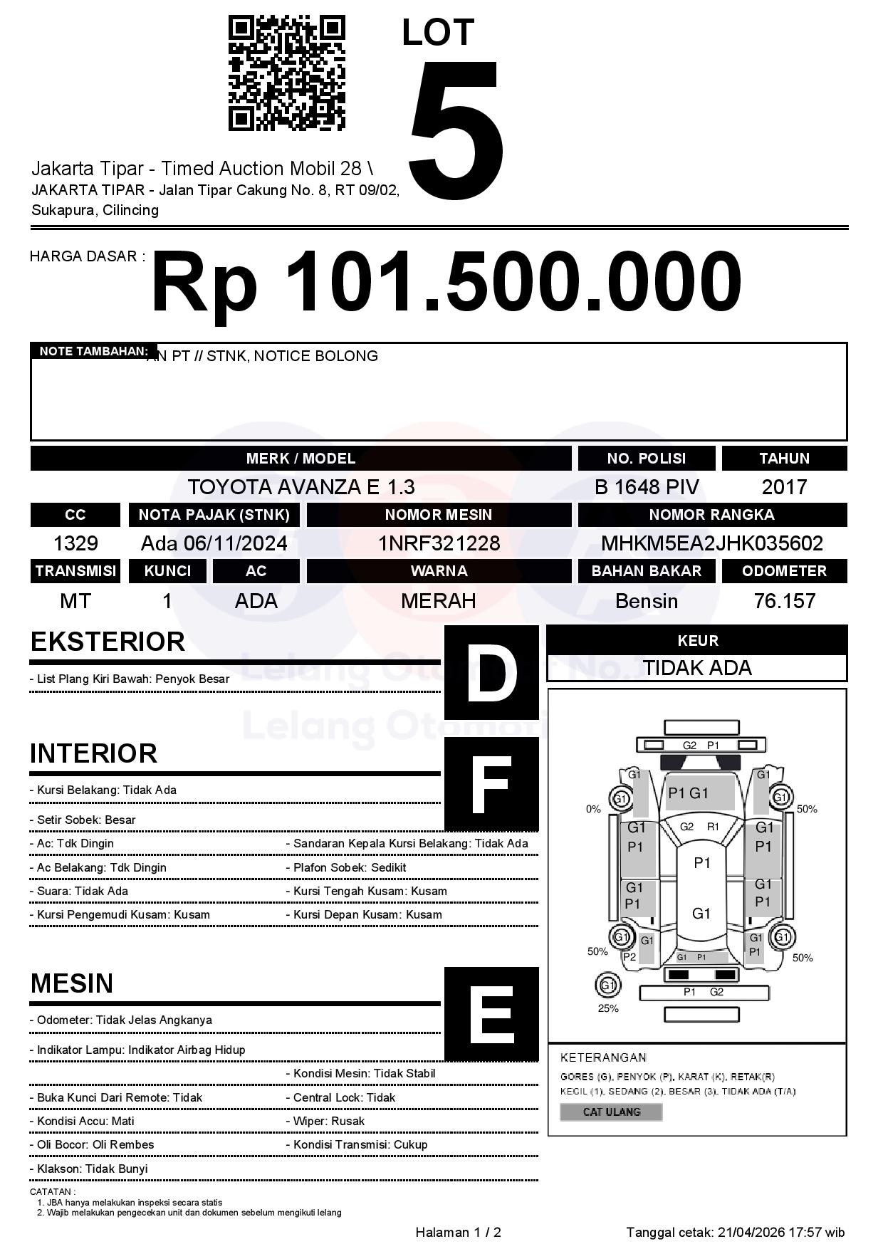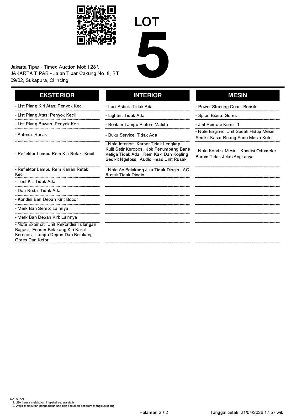 - Kondisi objek lelang dilelang apa adanya, baik kondisi fisik, mesin maupun legalitas kendaraan. Jika terdapat kekurangan/cacat baik yang terlihat maupun yang tidak terlihat, maka semua akan menjadi tanggung jawab/risiko Pemenang Lelang. Oleh karena itu, Pemenang Lelang melepaskan segala hak untuk menuntut dan/atau meminta ganti rugi atas hal tersebut kepada JBA.
