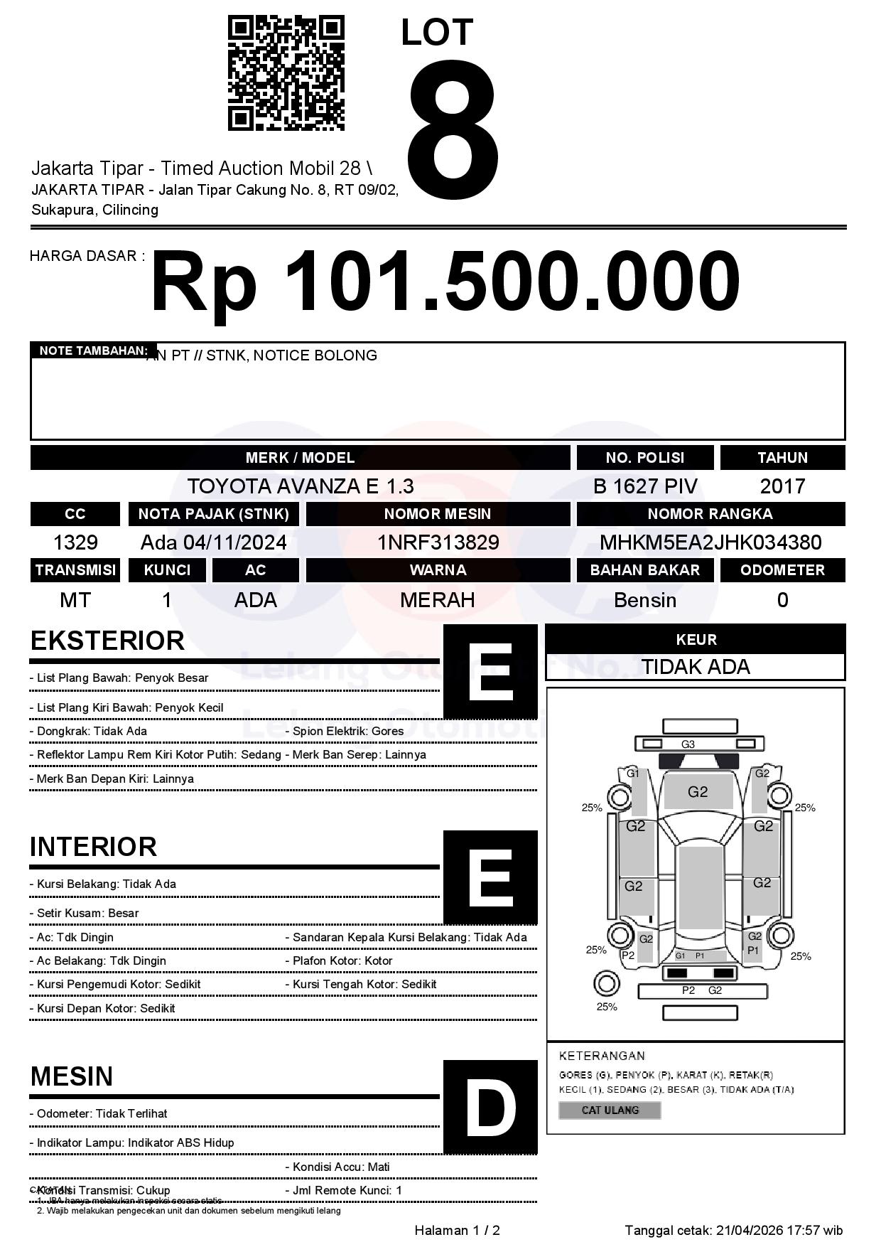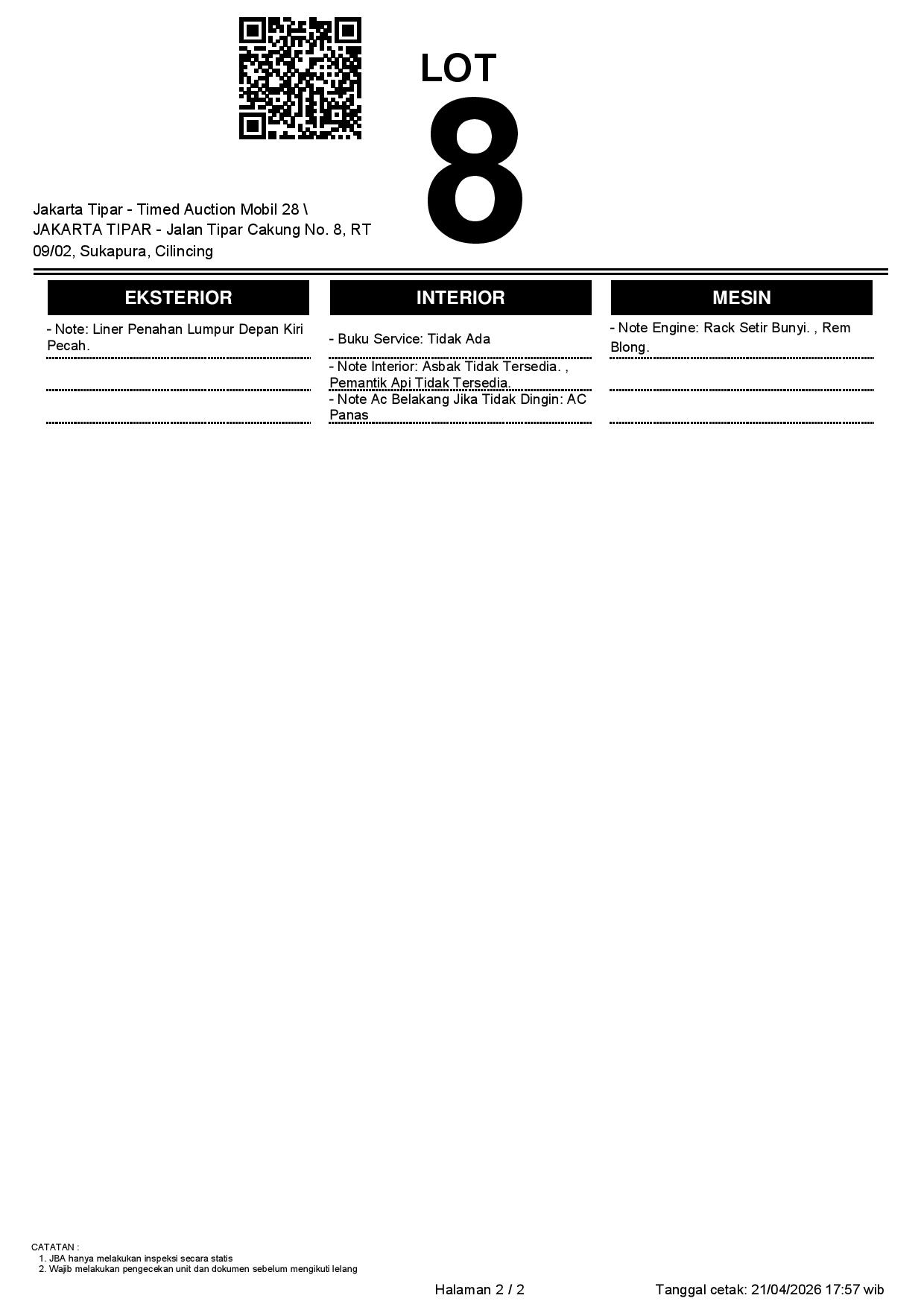 - Kondisi objek lelang dilelang apa adanya, baik kondisi fisik, mesin maupun legalitas kendaraan. Jika terdapat kekurangan/cacat baik yang terlihat maupun yang tidak terlihat, maka semua akan menjadi tanggung jawab/risiko Pemenang Lelang. Oleh karena itu, Pemenang Lelang melepaskan segala hak untuk menuntut dan/atau meminta ganti rugi atas hal tersebut kepada JBA.
